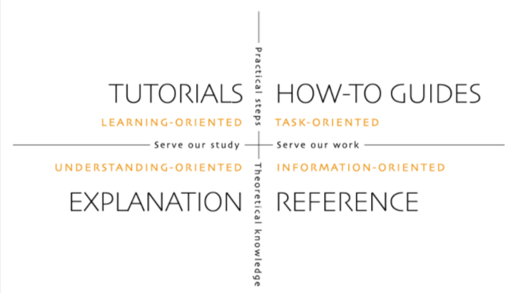 The Diátaxis framework is used throughout the documentation wherever appropriate. It provides a conceptual approach to writing, which in turn affects how documentation is created and how a set of pages is organised. Becoming familiar with Diátaxis is the first step to contributing.