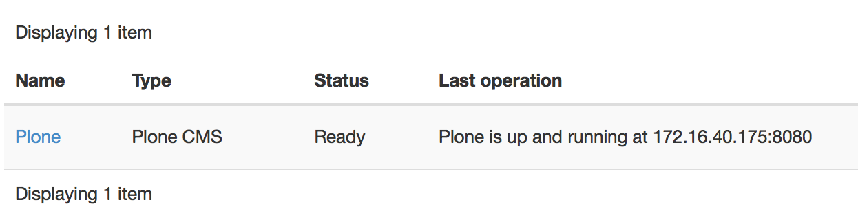 After the app is added to the environment, click the “Deploy this environment” button. The deployment will take about 10 minutes, depending on the speed of the VM’s internet connection and the amount of packages to be updated. When it is over, check the “Last operation” column in the environment’s list of components near the Plone component. It should contain a message “Plone is up and running at …” followed by ip address and port: