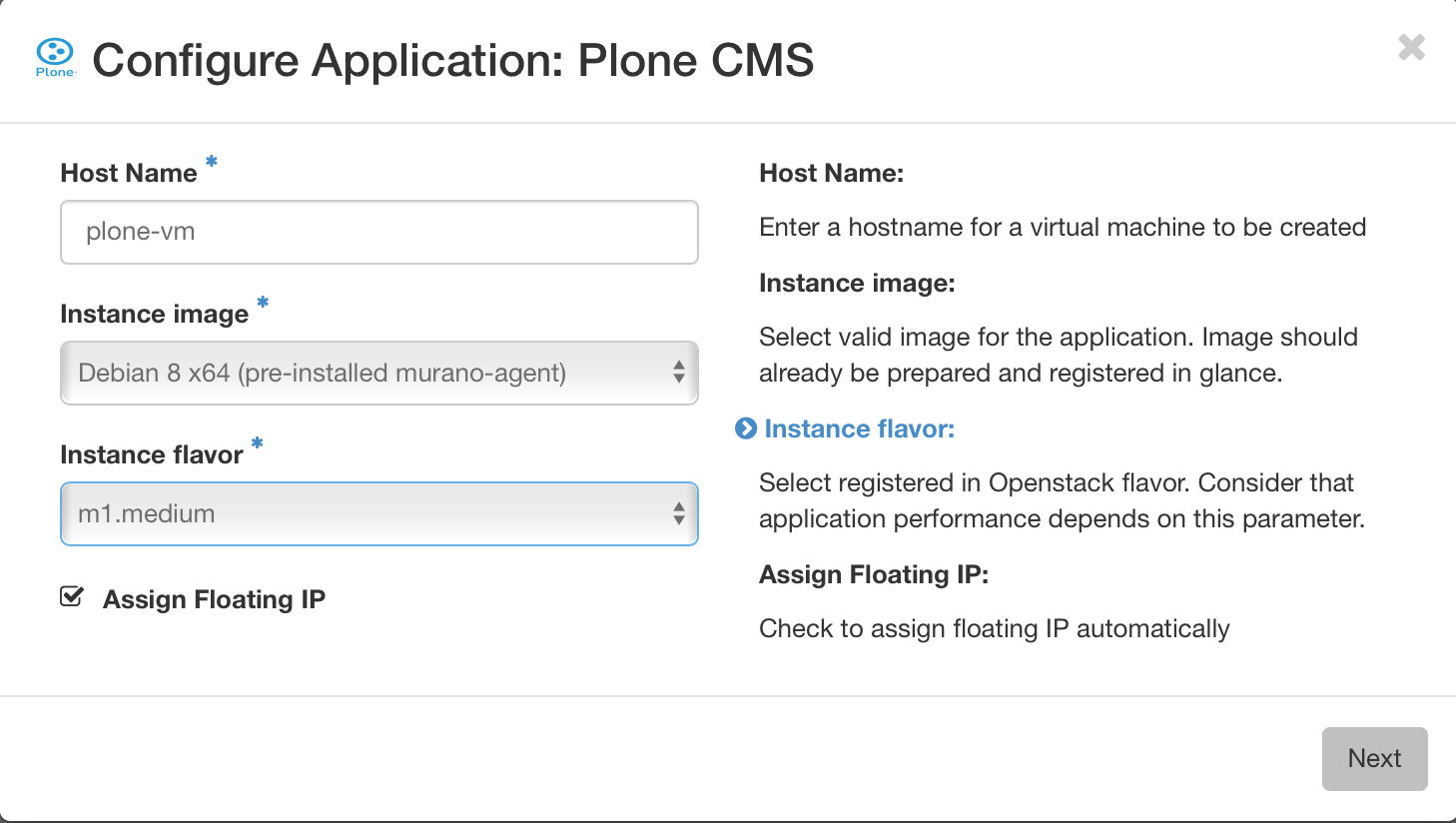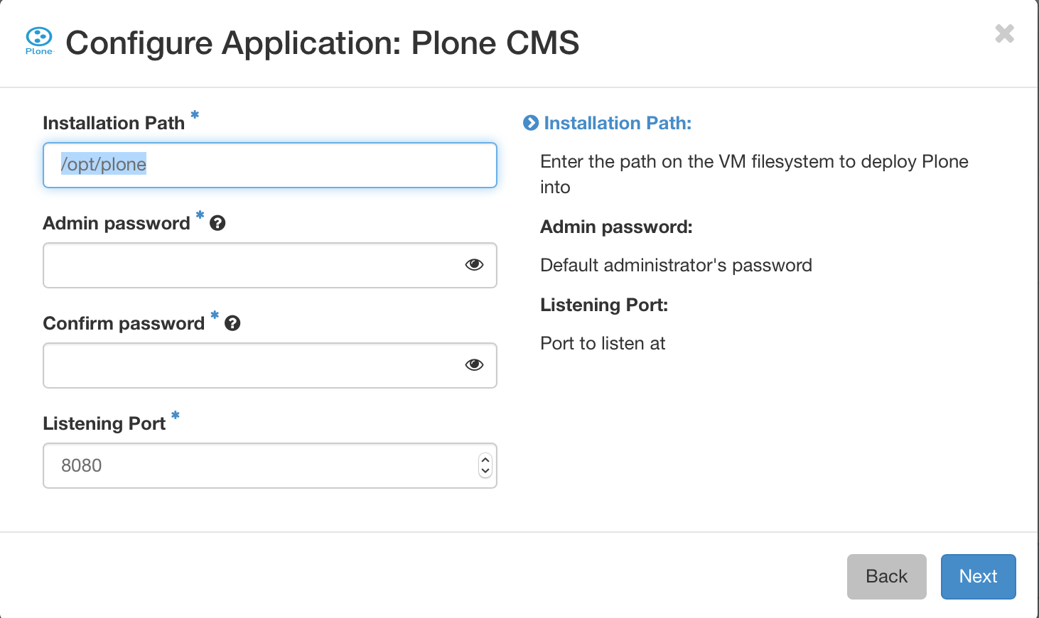 Go to Murano Dashboard, create an environment and add a “Plone CMS” application to it. You’ll see the nice wizard with all the field labels and descriptions you’ve added to the ui definition file: