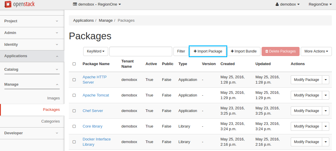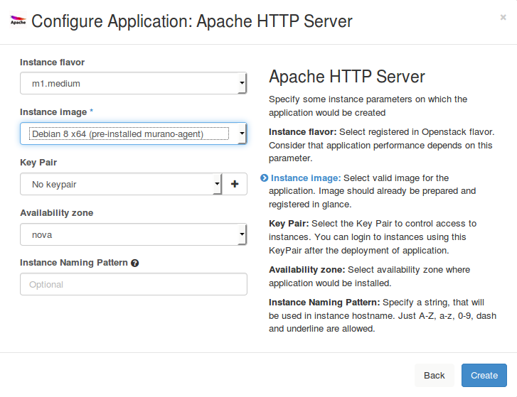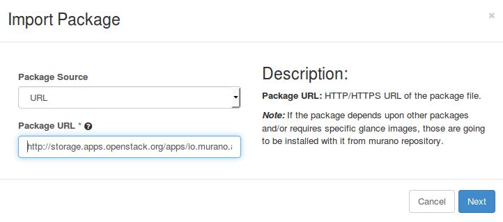 URLfrom thePackage Sourcedrop-down list;Specify the URL in the Package URL field. Lets upload the Apache HTTP Server package using http://storage.apps.openstack.org/apps/com.example.apache.ApacheHttpServer.zip;