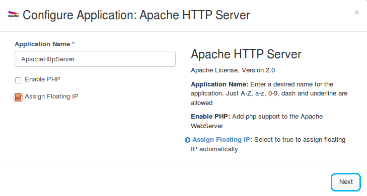 Click on the Quick Deploy button from the required application from the list. Lets deploy Apache HTTP Server, for example: