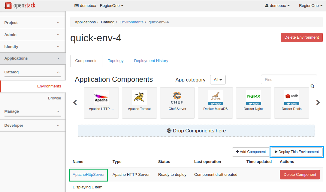 Click on the name of the environment to view its details, which include components, topology, and deployment history.