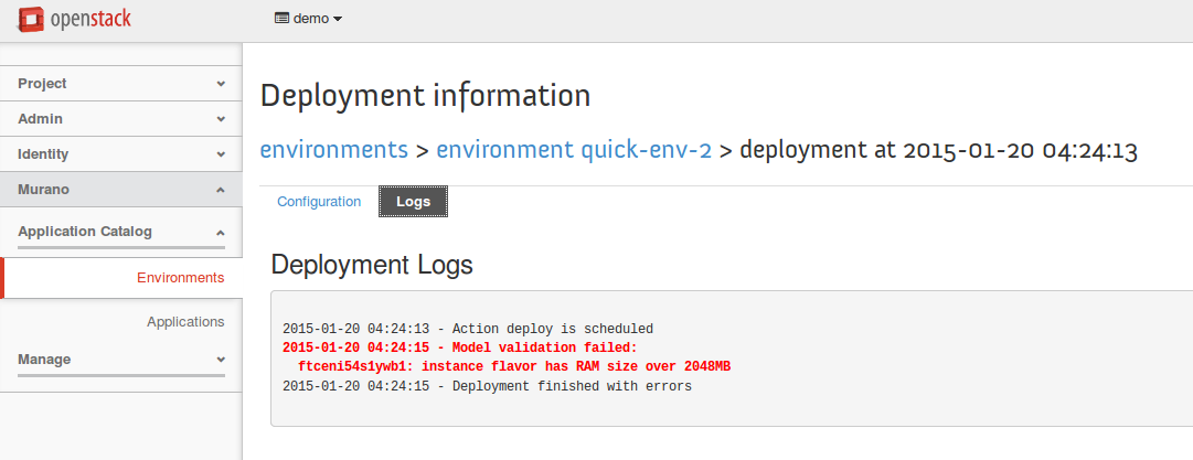 predeploy_errors(eid, obj_id, msg) :- murano:objects(obj_id, pid, type), murano:objects(eid, tid, "io.murano.Environment"), murano:connected(eid, pid), murano:properties(obj_id, "flavor", flavor_name), flavor_ram(flavor_name, ram), gt(ram, 2048), murano:properties(obj_id, "name", obj_name), concat(obj_name, ": instance flavor has RAM size over 2048MB", msg)