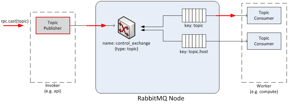 - once the message is dispatched by the exchange, it is fetched by the Topic Consumer dictated by the routing key (such as ‘topic.host’) and passed to the Worker in charge of the task.
