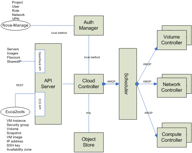 Nova uses direct, fanout, and topic-based exchanges. The architecture looks like the one depicted in the figure below: