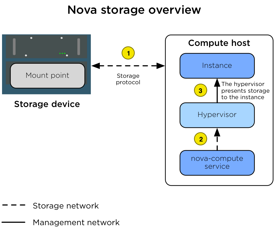 Der Compute-Host ist mit Zugriff auf das Speichergerät konfiguriert. Der Compute-Host greift über das Speichernetzwerk (br-storage) auf den Speicherplatz zu, indem er ein Speicherprotokoll verwendet (z. B. NFS, iSCSI oder Ceph RBD).