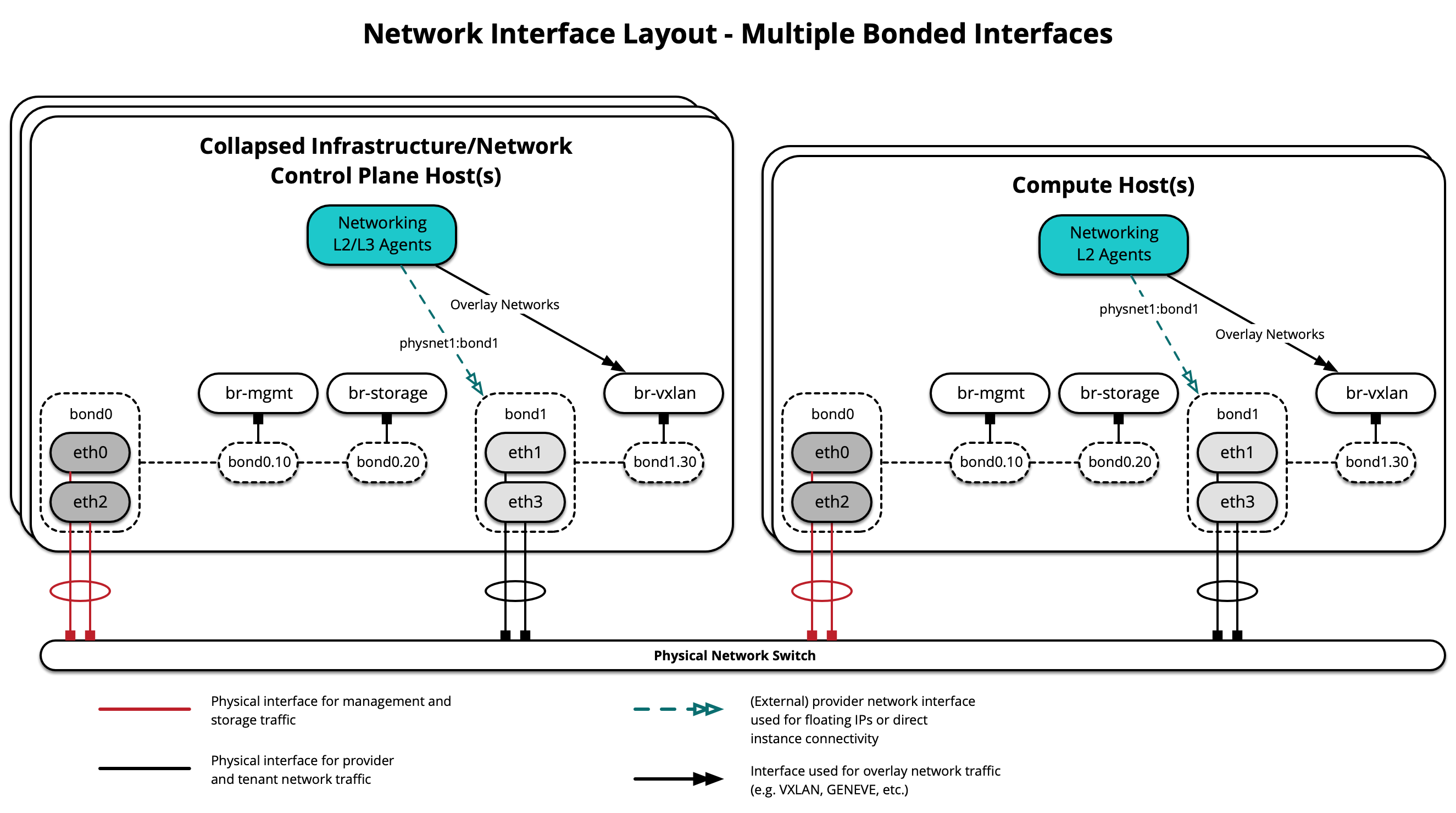 OpenStack-Ansible mendukung penggunaan antarmuka tunggal atau serangkaian antarmuka terikat yang membawa lalu lintas untuk layanan OpenStack dan juga instance.