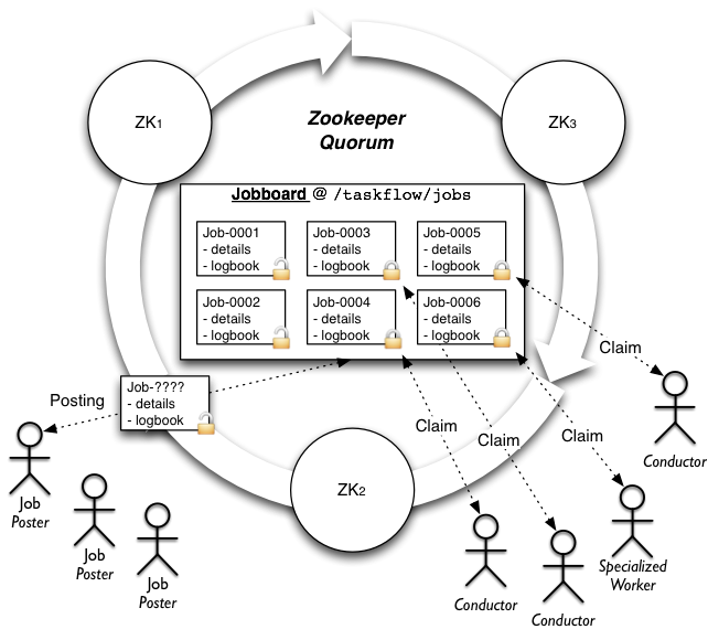 jobboardis responsible for managing the posting, ownership, and delivery of jobs. It acts as the location where jobs can be posted, claimed and searched for; typically by iteration or notification. Jobboards may be backed by different capable implementations (each with potentially differing configuration) but all jobboards implement the same interface and semantics so that the backend usage is as transparent as possible. This allows deployers or developers of a service that uses TaskFlow to select a jobboard implementation that fits their setup (and their intended usage) best.