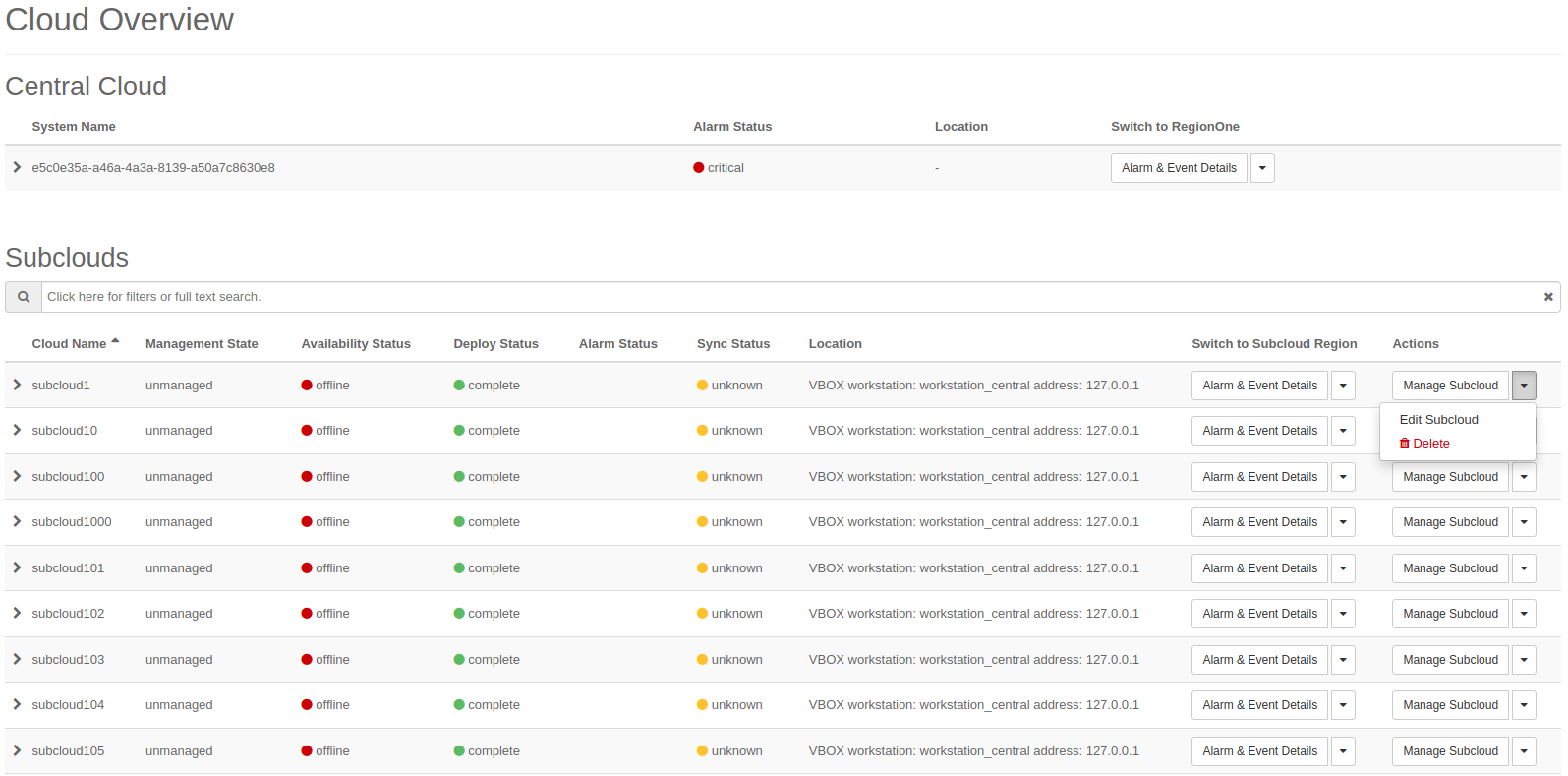 You can perform full-text searches or filter by column using the search-bar above the subcloud list.